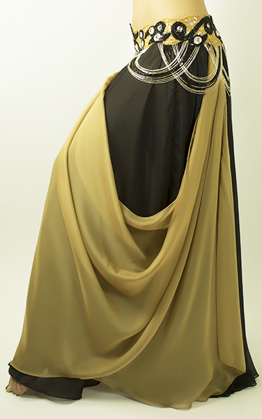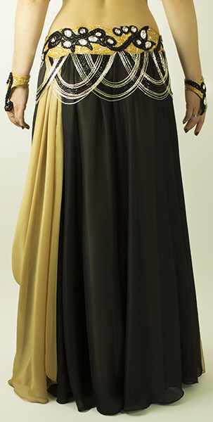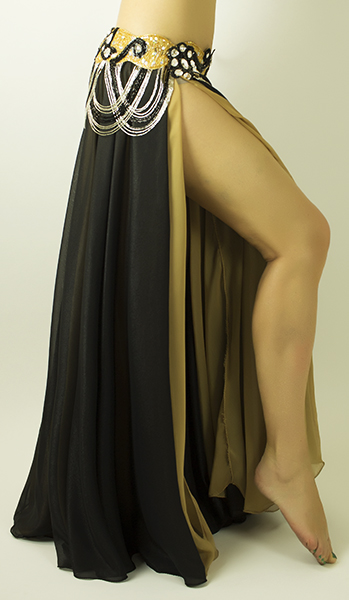 Bra: small C cup. 33" from end to end under bust.Belt+Skirt: full double-layer chiffon skirt (bottom beige, upper black) with one slit. Belt attached to the skirt. Belt 37" from end to end, set at 35", skirt length: 39".