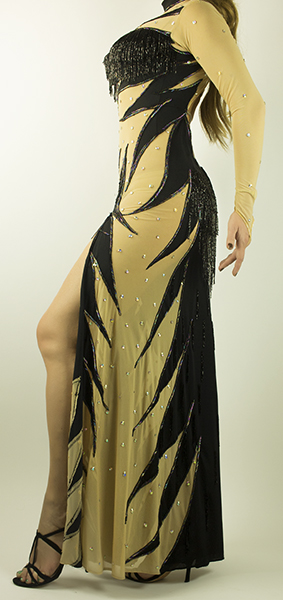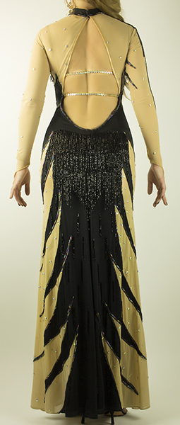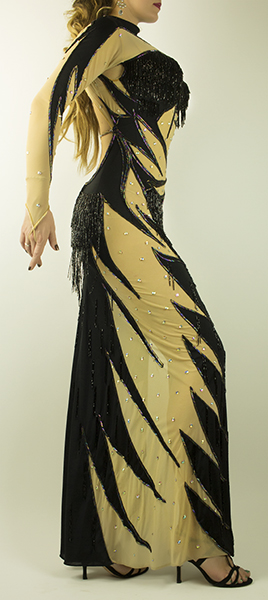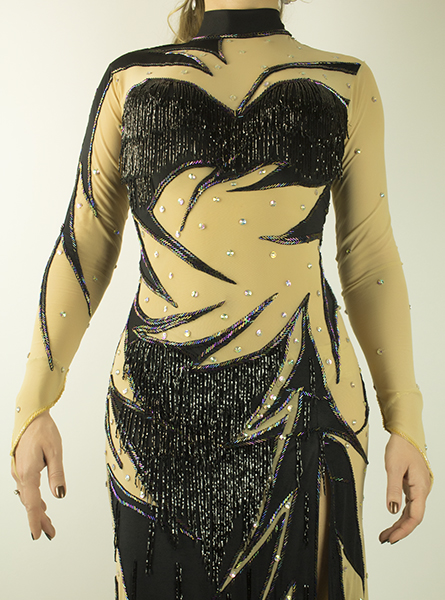 Includes: dress. Fabric: black lycra and skin color mesh. Beading: black, AB crystal stones.