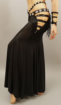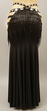 Includes: bra, skirt, wrist cuffs, headband, half-circle chiffon veil. Fabric: black metallic lycra, nude mesh. Beading: black, silver, clear stones.