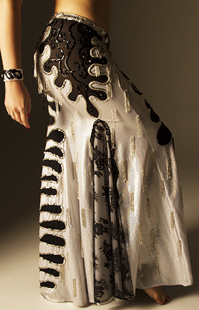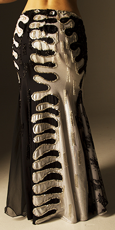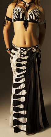 Includes: bra, skirt, arm bands, wrist cuffs, head band, half-circle chiffon veil. Fabric: black lycra and metallic silverwhite lycra, black and white chiffon, black lace. Beading: black and silver; AB and white stones.