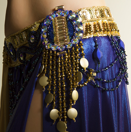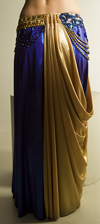 Includes: bra, skirt, sleve, arm band, wrist cuff, headband, half-circle chiffon veil. Fabric is metallic copper lycra and gold lycra. Beading: blue and gold; lots of AB crystal stones.