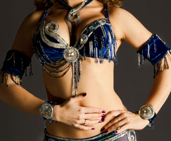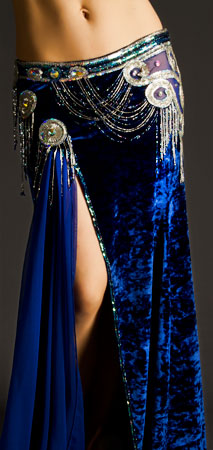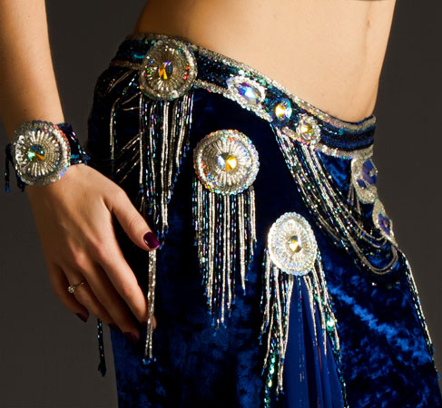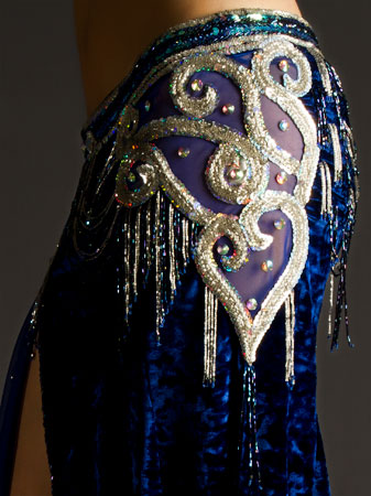 Includes: bra, skirt, arm bands, wrist cuffs, necklace, headband, half-circle chiffon veil. Fabric is blue heavy crushed velvet and blue chiffon. Beading: blue and silver; AB crystal stones.