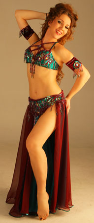 Includes: bra, belt, skirt, arm bands, head band, half-circle chiffon veil. Fabric is burgundy velvet and chiffon, teal lycra and chiffon. Beading: burgundy and teal; 31 AB crystal stones.