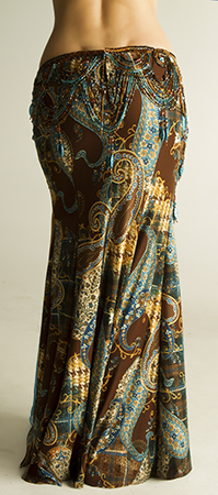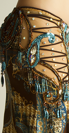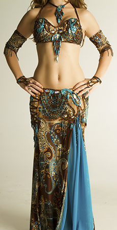Includes: bra, skirt, arm bands, wrist cuffs, necklace, headband, half-circle chiffon veil. Fabric brown/turquoise paisley print lycra and turquoise chiffon. Beading: brown and turquoise; AB crystal stones.