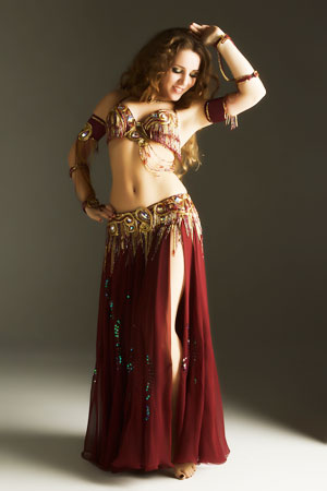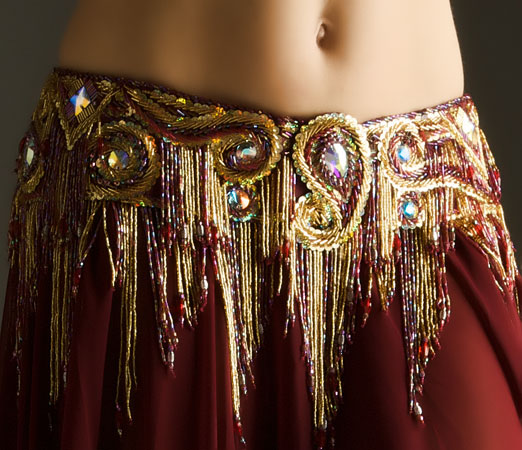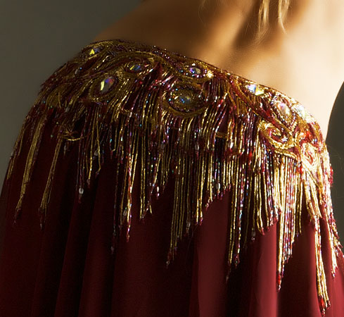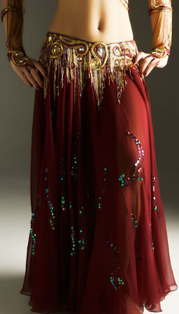 Includes: bra, belt, skirt, beaded sleeves, headband, half-circle chiffon veil. Fabric is burgundy lycra and burgundy chiffon. Beading: burggundy and gold; 33 AB crystal stones.