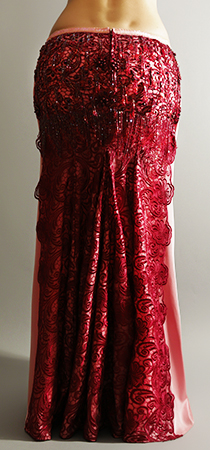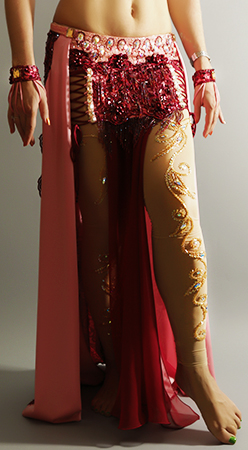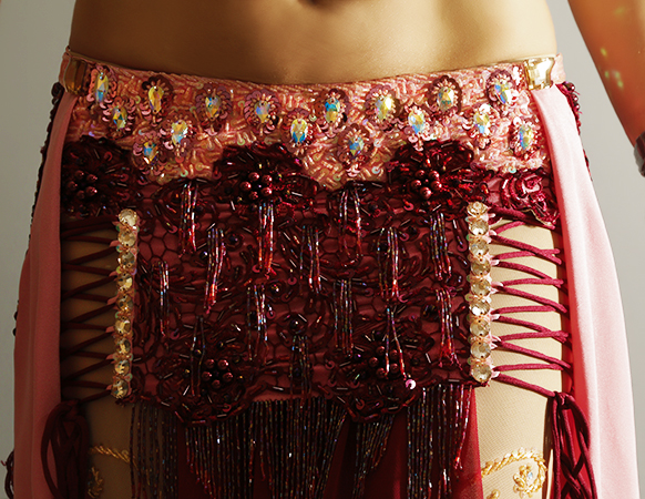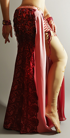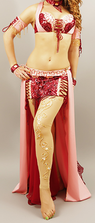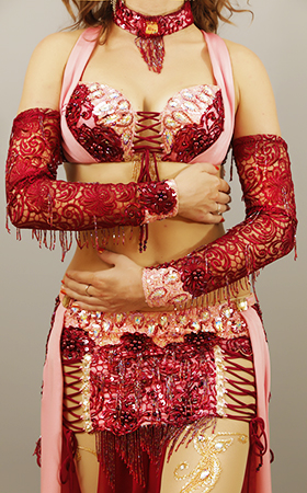 Includes: bra, skirt, mesh leggins, sleeves, arm bands, wrist cuffs, choker necklace, headband, half-circle chiffon veil. Fabric: pink lycra, burgundy lace and burgundy chiffon, nude mesh. Beading: pink and burgundy, AB stones.