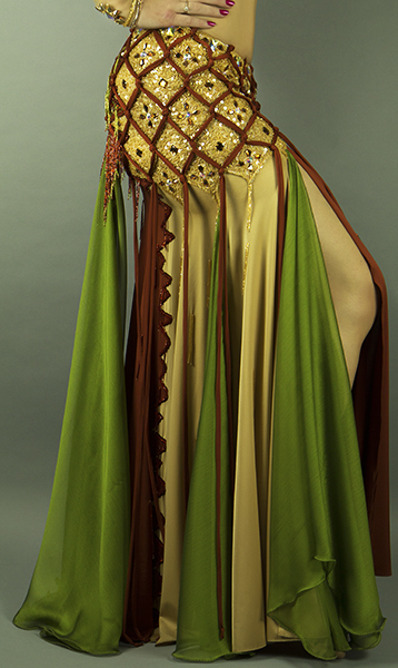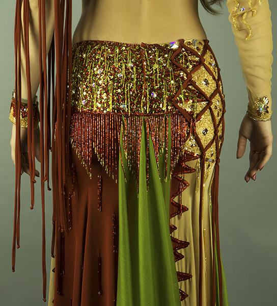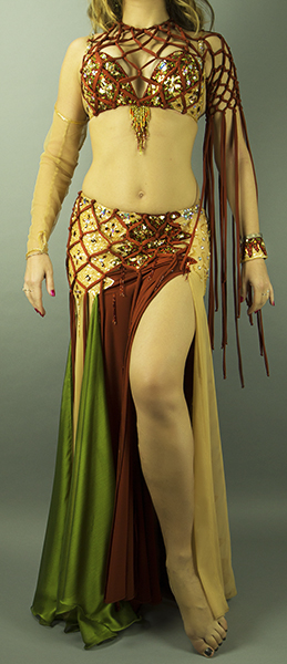 Includes: bra, skirt, attached sleeve, one wrist cuff, half-circle chiffon veil. Fabric: copper brown lycra, skin color lycra, olive chiffon. Beading: copper, olive, AB and colored stones.