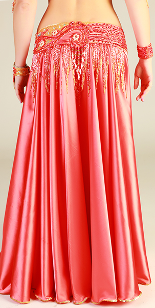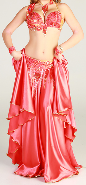 Includes: bra, belt, skirt, arm bands, wrist cuffs, necklace, headband, half-circle chiffon veil. Fabric: coral satin-like. Beading: coral, red, skin-color, gold, pearls, AB stones.