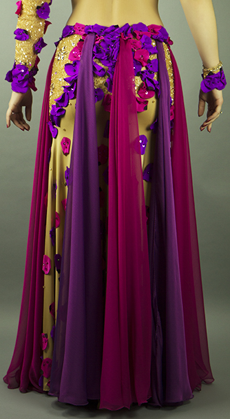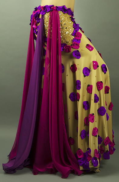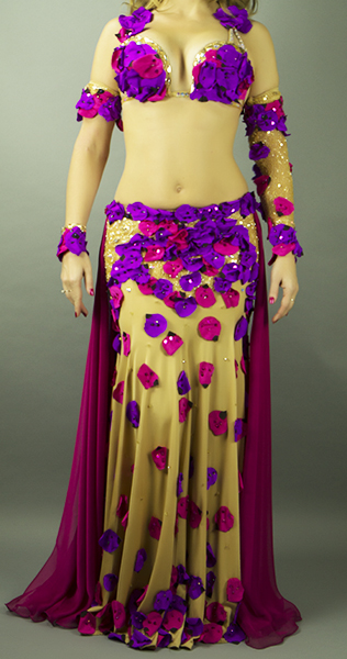 Includes: bra, skirt, attached sleeve, one sleeve, one arm band, one wrist cuff, half-circle chiffon veil. Fabric: skin color lycra, fuchsia and magenta lycra and chiffon. Beading: skin color, pink, purple, AB and colored stones.