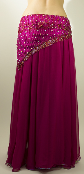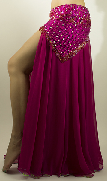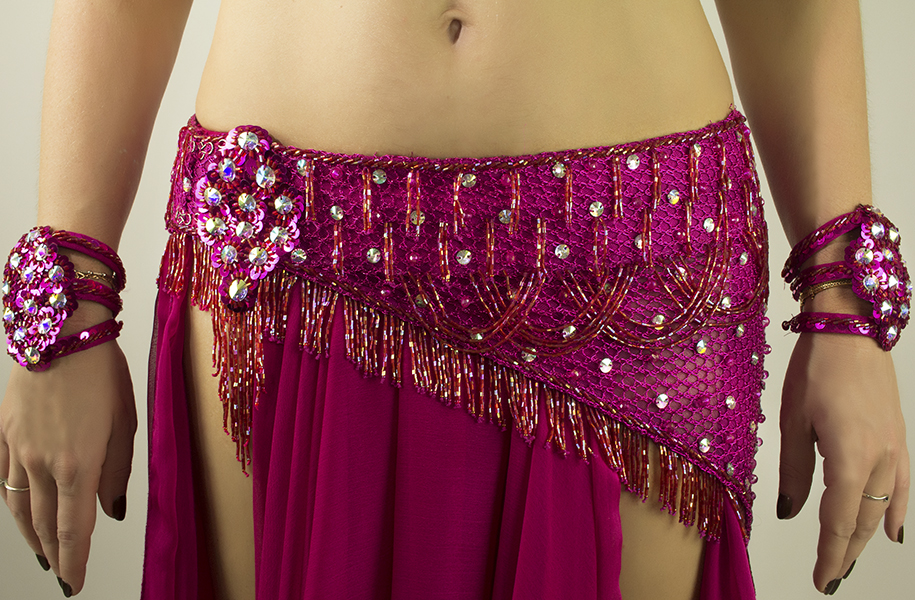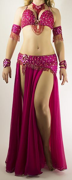 Includes: bra, sash belt, skirt, arm bands, wrist cuffs, necklace, half-circle chiffon veil. Fabric: fuchsia chiffon, metallic fuchsia net. Beading: fuchsia, AB stones.
