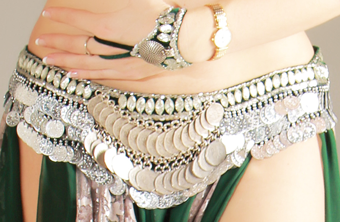 Includes: bra, skirt, wrist cuffs, necklace, headband, half-circle chiffon veil. Fabric: dark green chiffon, dark green velvet, and metallic silver lace. Beading: silver, silver stones, heavy and lighweight silver coins.