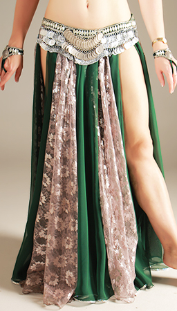 Bra: B/small C cup. 34" from end to end under bust.Skirt: full chiffon skirt with silver lace panels, two slit in front. One-piece belt attached to the skirt. Belt: 37" from end to end (currently set to 34"). Skirt length: 39".