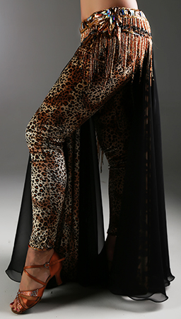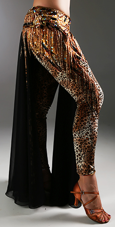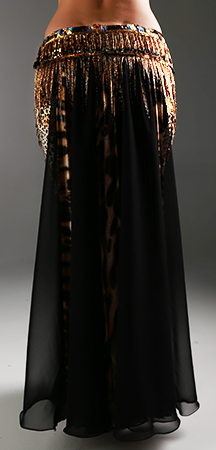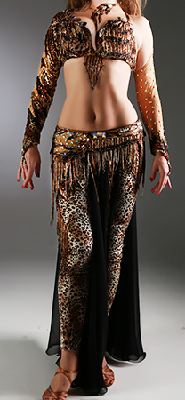 Includes: bra with sleeves, leggins pants, belt with panels, necklace, half-circle chiffon veil. Fabric: leopard print velvet. Beading: gold, brown, black, AB stones. Since the belt is separate can be worn with chiffon or any kind of skirt instead of pants.