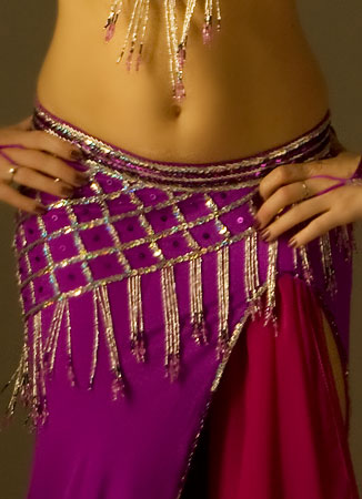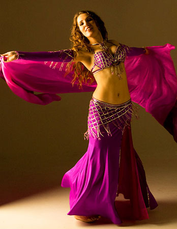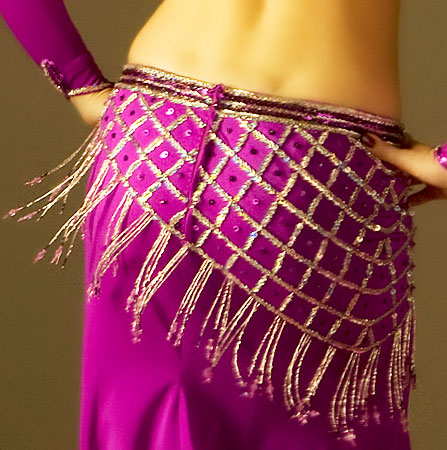 Includes: bra, skirt, sleeves, necklace, headband, half-circle chiffon veil. Fabric is magenta lycra and fuchsia chiffon. Beading: magenta and silver; 2 crystal stones.