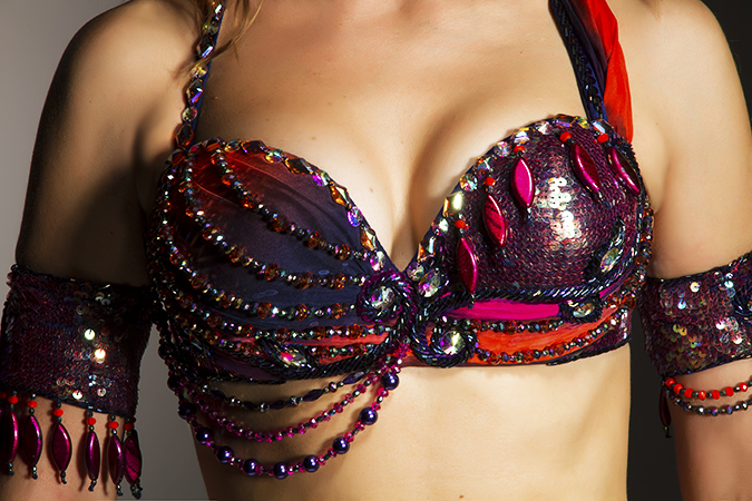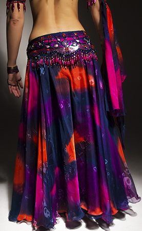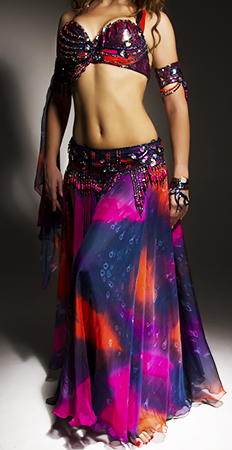 Includes: bra, belt, skirt, arm bands, wrist cuff, headband, half-circle silk print veil. Fabric: navy/multi print silk and navy chiffon. Beading: pink, orange, blue, AB and colored crystal stones.