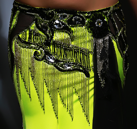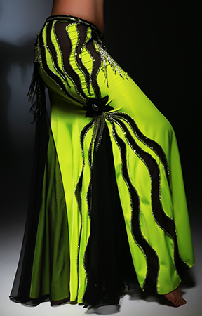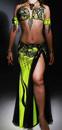 Includes: bra, skirt, arm bands, wrist cuffs, necklace, head band, half-circle chiffon veil. Fabric: neon yellow lycra and black chiffon. Beading: lime green, silver, black, silver stones.