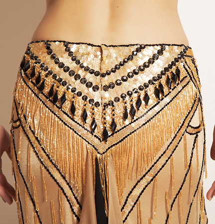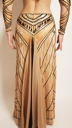 Includes: bra, skirt, sleeves, necklace, half-circle chiffon veil. Fabric: nude-colored lycra and nude-colored and black chiffon. Beading: beige and black, AB and black-colored stones.