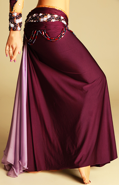 Includes: bra, skirt, sleeves, necklace, headband, half-circle chiffon veil. Fabric: plum lycra, lilac chiffon, flowerlace. Beading: purple, blue, AB stones.