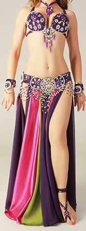 Includes: bra, belt, skirt, wrist cuffs, necklace, anklets, half-circle chiffon veil. Fabric: purple velvet, metallic pink lycra and purple and green chiffon. Beading: multicolor and milticolor and AB stones.