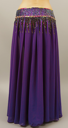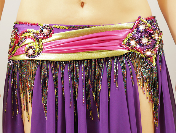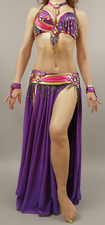 Includes: bra, belt, skirt, wrist cuffs, necklace (non-bella), half-circle chiffon veil. Fabric: purple lycra and purple chiffon, pink and green metallic lycra accents. Beading: pink, green, iris purple, some AB stones.