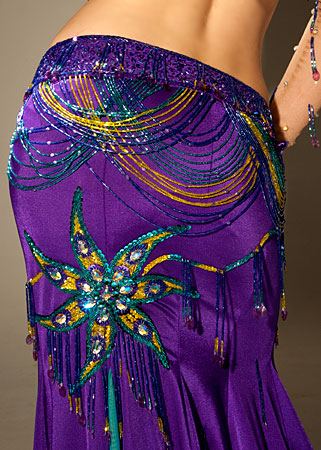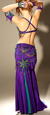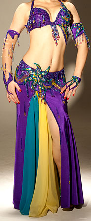 Includes: bra, belt, skirt, arm band, wrist cuff, sleeve, headband, half-circle chiffon veil. Fabric is purple lycra and turquoise and yellow chiffon. Beading: purple, turquoise, yellow, lots of AB crystal stones.