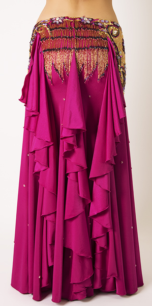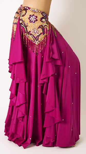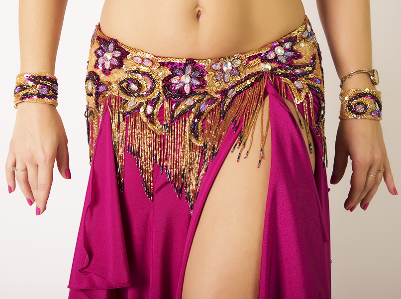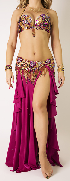 Includes: bra, skirt, arm bands, wrist cuffs, half-circle chiffon veil. Fabric: raspberry pink lycra. Beading: pink, purple, gold. Colored stones.