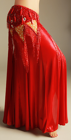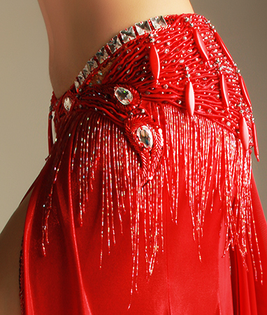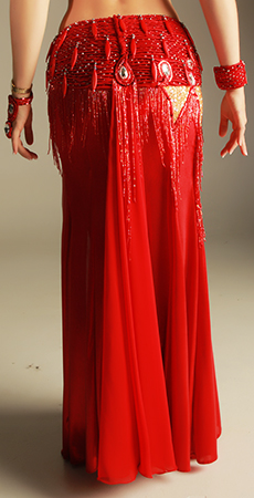 Includes: bra, skirt, arm band, wrist cuff, necklace, head band, half-circle chiffon veil. Fabric: red metallic lycra. Beading: red and dark silver, clear stones.