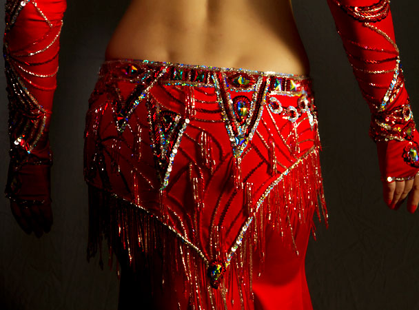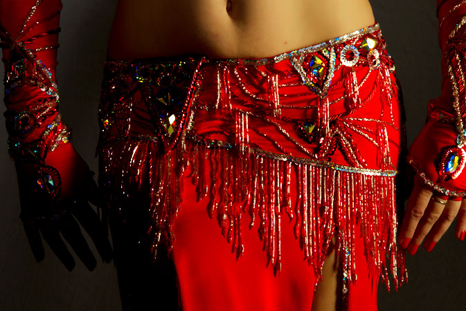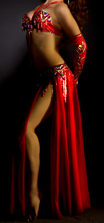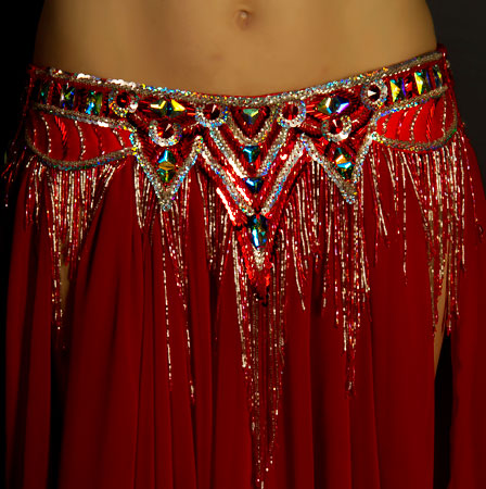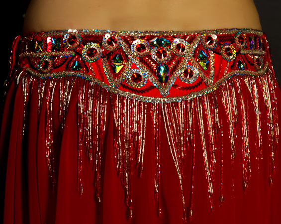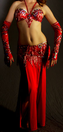 Includes: bra, two belts, two skirt, gloves, headband, half-circle chiffon veil. Fabric is red lycra and chiffon. Beading: red and silver; AB and colored crystal stones.
