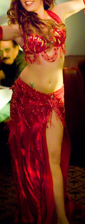 Includes: bra, skirt, sleeves, half-circle chiffon veil. Fabric is red velvet and red chiffon. Beading: red; lots of big and small AB crystal stones.