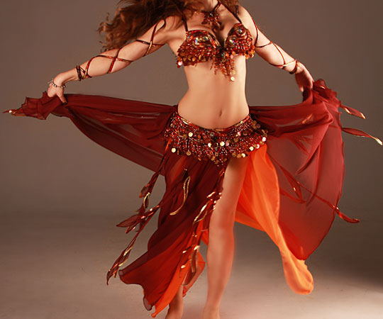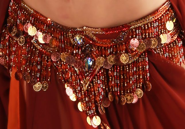 Includes: bra, belt, skirt, necklace, half-circle chiffon veil. Fabric is rust (between brown and burgundy) and orange chiffon. Beading: orange, brown, red and gold; 19 AB crystal stones; lightweight copper and gold coins.