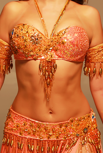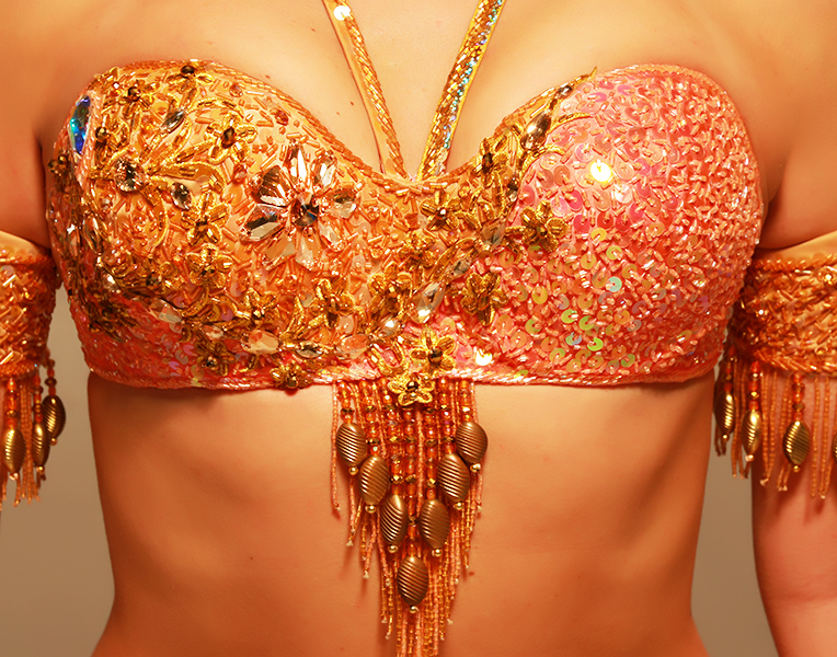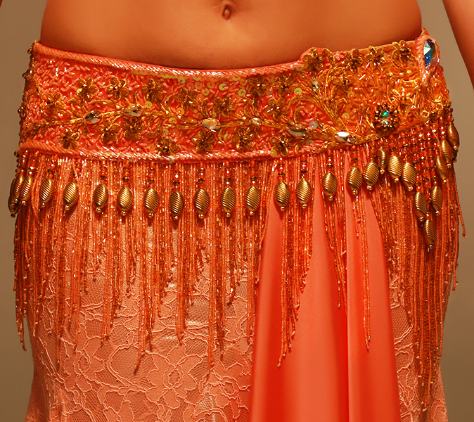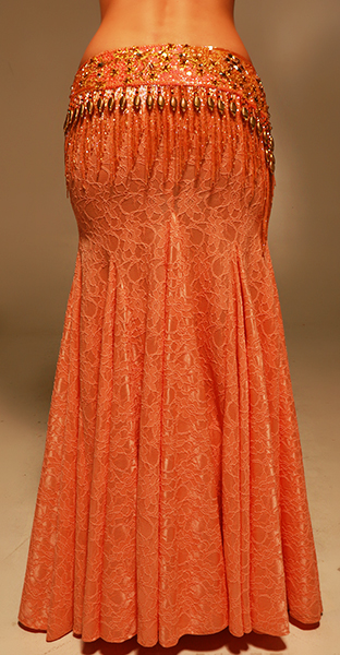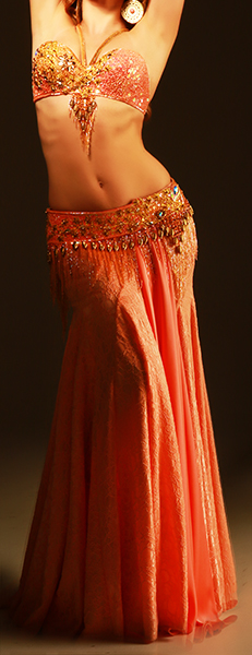 Includes: bra, two skirts, arm bands, wrist cuffs, headband, half-circle chiffon veil. Fabric: salmon lace, salmon satin. Beading: salmon, gold, AB stones.