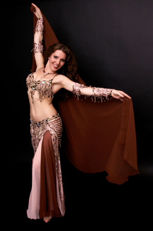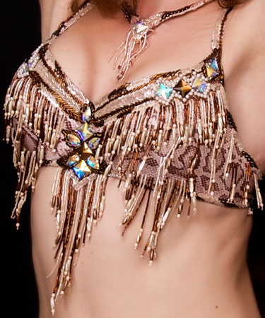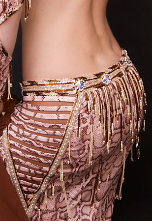 Includes: bra, skirt, sleeves, necklace, headband, half-circle chiffon veil. Fabric is shiny snake skin print lycra and brown and pinkish-beige chiffon. Beading: copper, cream, pearl; over 40 AB and copper-colored crystal stones.