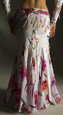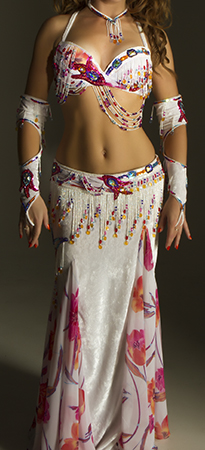 Includes: bra, belt, skirt, sleeves, necklace, headband, half-circle print chiffon veil. Fabric is white velvet and flower print chiffon. Beading: multi; AB crystal stones.
