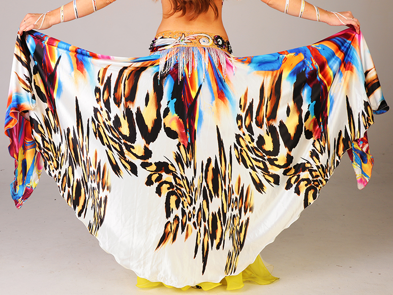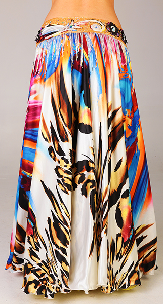 Includes: bra, belt, skirt, armbands with laces, necklace, half-circle chiffon veil. Fabric: white abstract animal print silk-like fabric. Beading: white, multi, pearls, AB stones.
