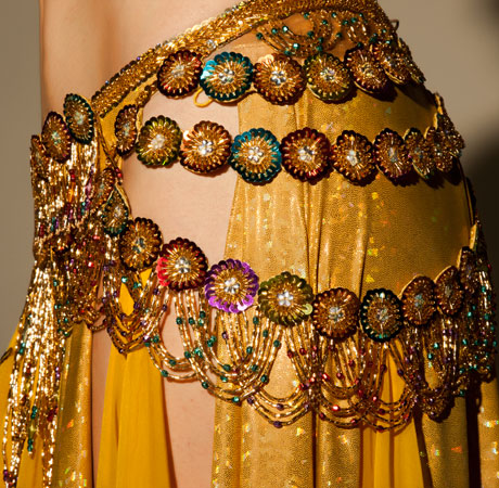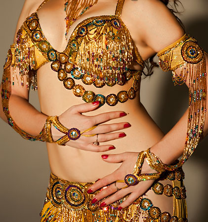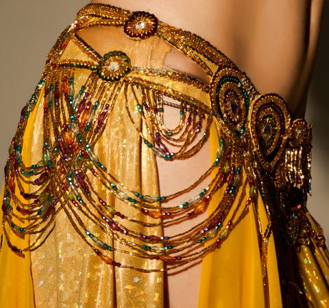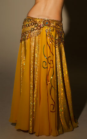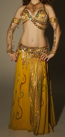 Includes: bra, belt, skirt, beaded sleeves, headband, half-circle chiffon veil. Fabric is gold holo lycra and yellow chiffon. Beading: gold and multi, lots of AB crystal stones.